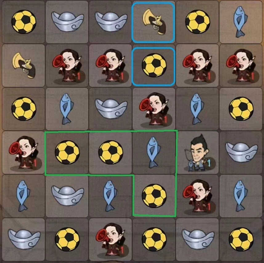若销毁蓝框中的火铳或者足球,能够消除5个格子,与此同时,会引发下方绿框的合成消除2格,总计消除7格。