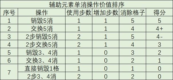 在不考虑连消的情形下,消辅助元素的操作价值排序为: