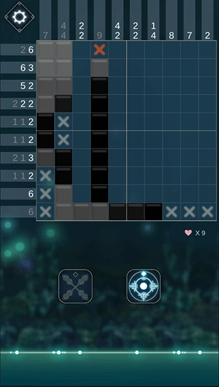 3、游戏玩法十分简单,类似扫雷,每行与每列都设有数字用以提示。其中,红色的“X”表示雷,每次点错就会扣除一次生命,当生命值耗尽,挑战即告失败。