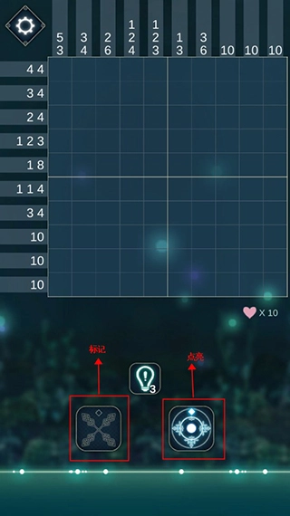 玩家需在下方选择按钮,左边的x是标记按钮,用于无需点亮之处,右边则是点亮按钮。