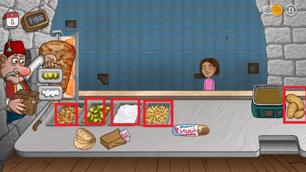 这里有四种材料,它们都是制作三明治所需的材料。至于薯条,需持续点击土豆,让其进入油锅,如此便能进行油炸。炸好后,再次点击,薯条就会自动放入材料盘。