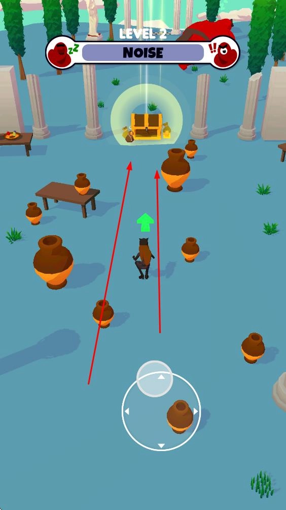 2、于场景中移动过程里,要留意上方的NOISE进度条,防止制造出过大的声响动静,并且要避开各类障碍物,如此方能顺利靠近宝箱,完成收集操作。