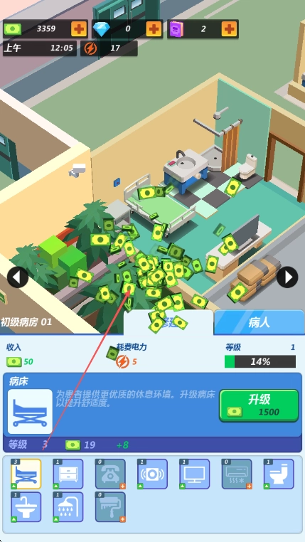 4、于初级病房01,借助升级病床等设施,按箭头指示获取收入,以维持医院的持续运营。