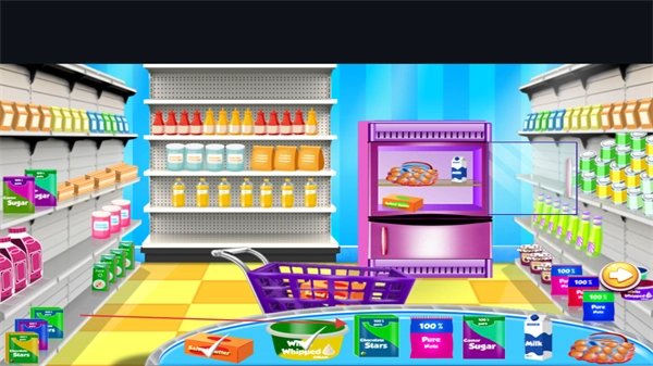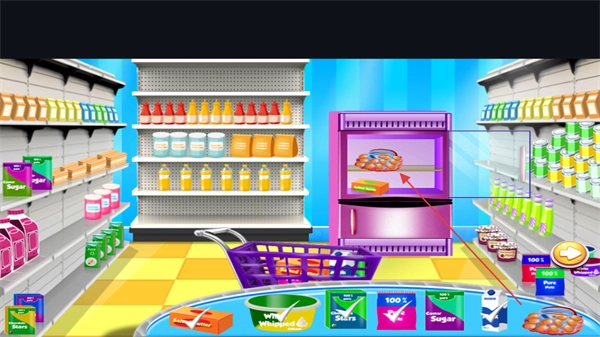 2. 于货架与冰柜里找寻面粉、奶油、蔬菜之类所需食材,并持续收集。