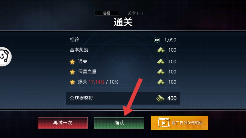 4、成功通关后,查看奖励详情,点击【确认】按钮,即可选择继续挑战后续关卡,或者进行其他操作。