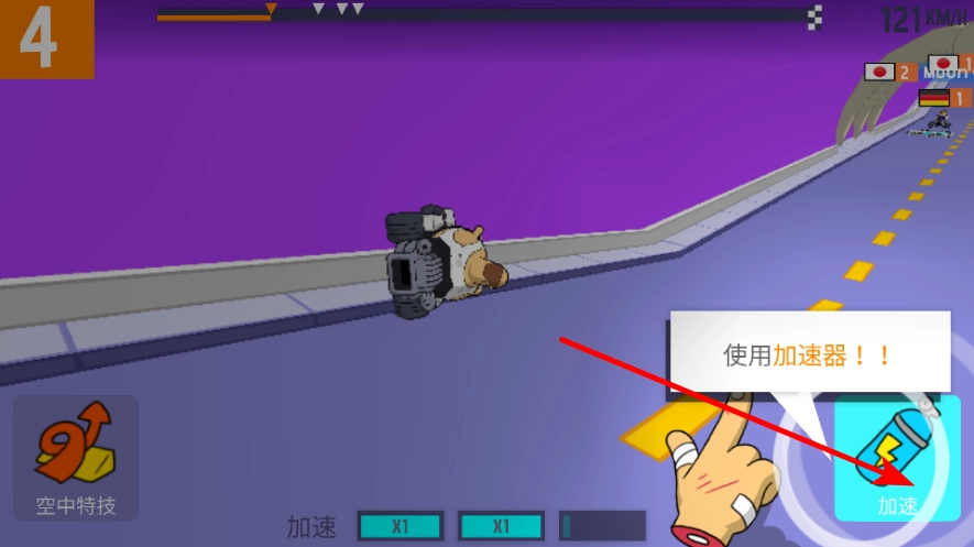 3、要想提升赛车速度,在关键路段与对手拉开差距,可以通过点击加速按钮来使用加速道具,借助加速器实现这一目的。