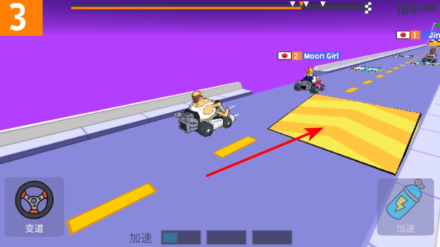 4、借助赛道加成,操控赛车驶过黄色加速带,从而获取赛道给予的速度加成,以此提升赛车速度,强化自身优势。