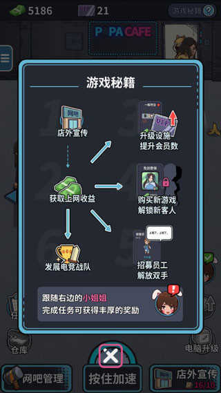 3、独具一格的游戏玩法,不受任何时间约束,负责管理网吧系统,进而赚取属于你的佣金。