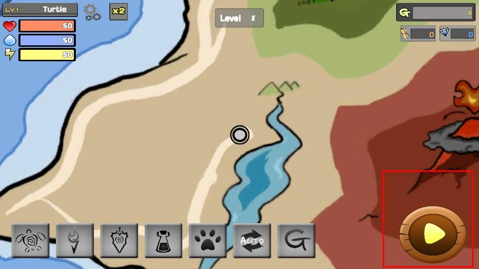 1. 在地图界面,点击右侧的木质播放按钮,选中LV1 Turtle角色,随后玩家便进入海滩关卡,开启冒险之旅。