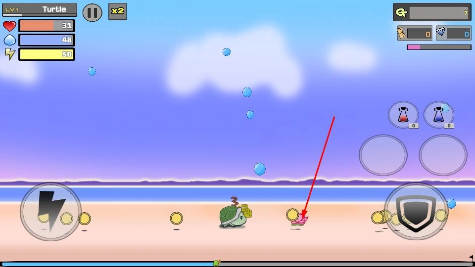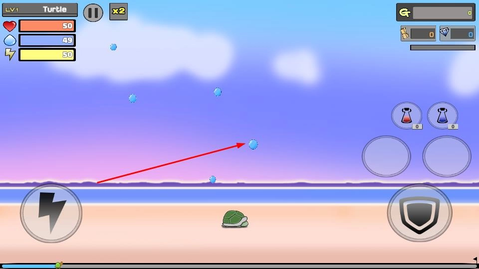 2. 在海滩场景中操控乌龟进行移动,收集空中的蓝色水滴,以此维持左上角血量、水量等属性条的状态,点击左侧的闪电按钮即可释放技能。