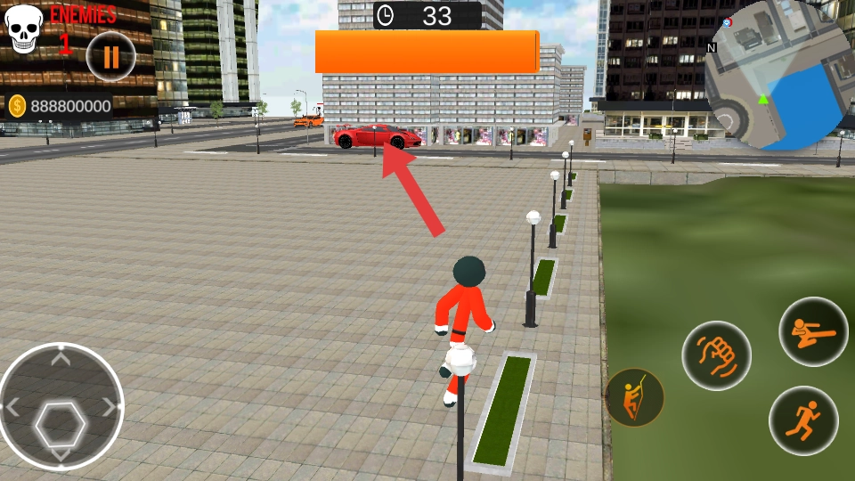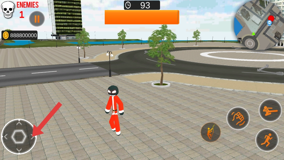 2、借助虚拟摇杆操控火柴人角色于城市广场中移动,此乃探索场景以及完成任务的基础操作。界面上呈现出敌人数量与金币数。