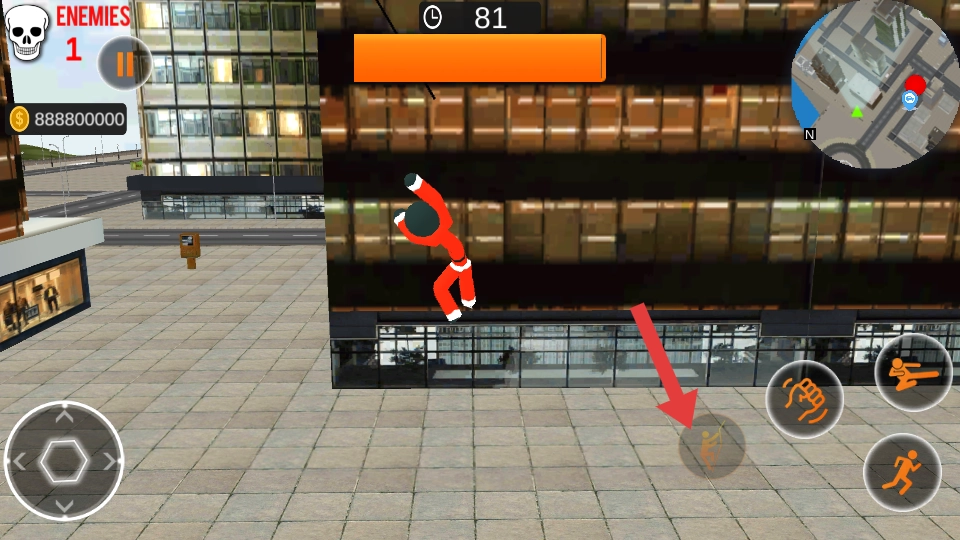 3、轻点技能按钮,让火柴人角色做出攀爬建筑等特殊动作。借助这些特殊动作,角色能够抵达不同区域,探索全新的游戏内容。