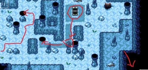 还是第三层,最下面那个冰场一开始是过不去的,得走右边那个梯子,上去之后会看到一个箱子,把技能切换成“推”,按照图示把石头推下去,这样才能通过第三层的那个冰场。