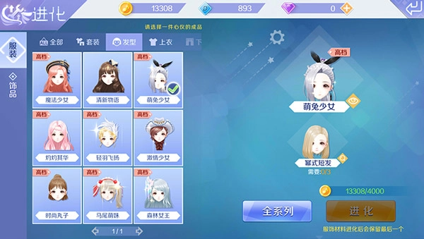 最后,工坊的服饰进化系统里还包含不少发型,玩家需要集齐3个相同的发型,才能将其进化为带有光效的高档发型。其中萌兔少女、森林女王这两款发型十分值得收集,点击发型即可查看具体获取方式,不过收集过程同样具有一定难度。