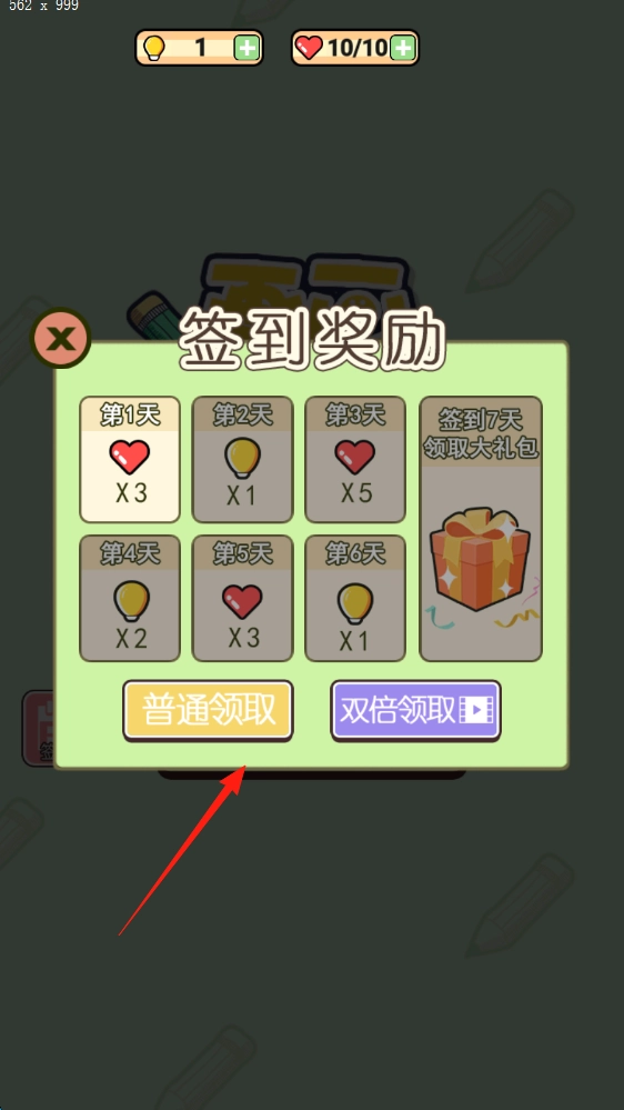 进入签到奖励页面,点击普通领取按钮,即可获得每日签到道具,连续积累7天就能领取礼包。
