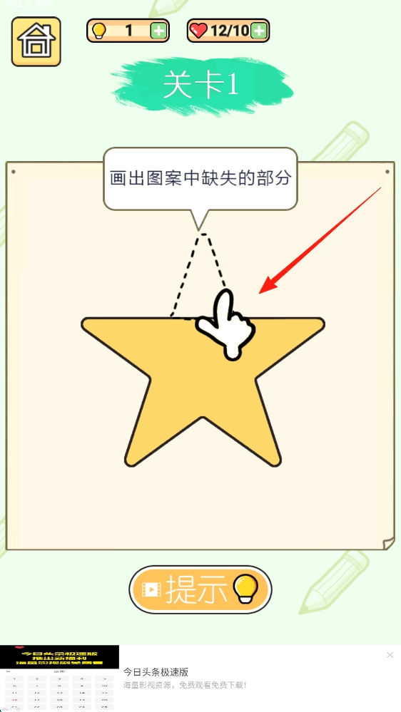 第一关里,仔细留意画面中的图形,用手指补画出缺少的那部分线条,让图形完整呈现,这样就能顺利闯过这一关了。