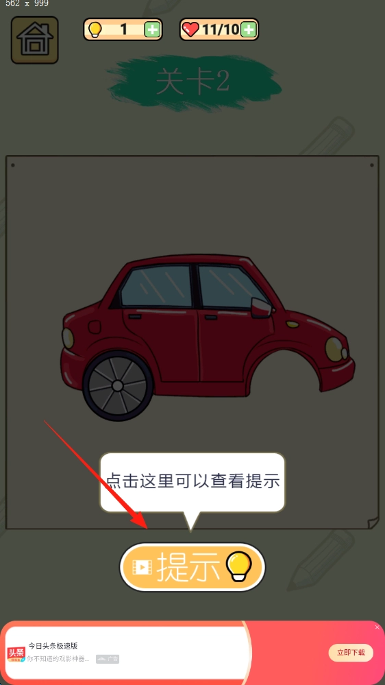 在关卡2中遇到困难时,你可以点击提示按钮,通过观看视频或者获取线索的方式,来完成汽车的补全任务。