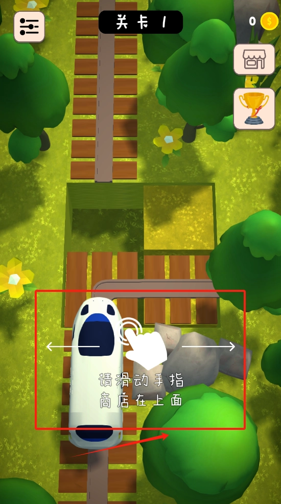 用手指在屏幕上滑动,就能操控那辆白色的小汽车向前行驶啦,要留意一下,商店就在画面的最上方哦。