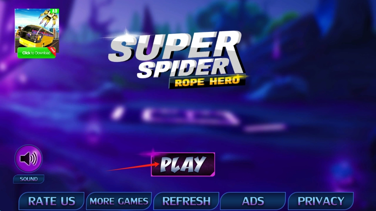 在Super-Spider-Rope-Hero的界面中,点击PLAY按钮即可开启城市冒险之旅,化身为绳索英雄,随后点击对应按钮就能开始游戏。