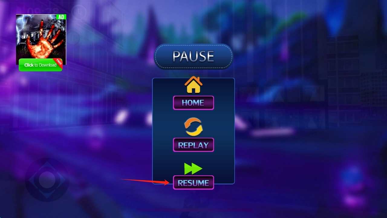 暂停时点击RESUME按钮可继续游戏进程,若想重新游玩可选择REPLAY,返回主界面则点击HOME,确认后点击对应按钮即可继续操作。