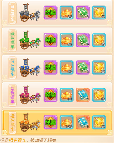 在日常活动里找到每日押镖玩法,挑选不同品质的镖车能获取角色经验,品质越好,最后得到的经验就越多,每天最多可以押镖3次、抢镖5次,不管是押镖还是抢镖都能获得角色经验。