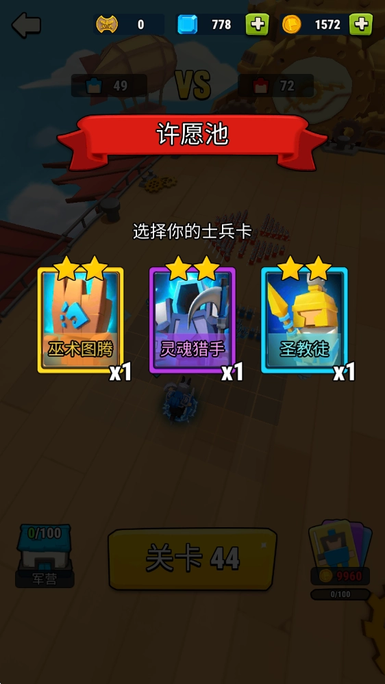 另外需要积累召唤士兵的进度条,等进度条填满后,就可以从随机出现的三个英雄里挑选一个获取。