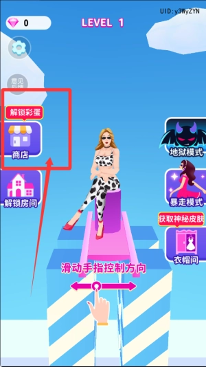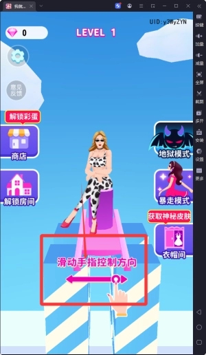基础玩法为滑动屏幕操控女王移动方向,避开障碍物并收集道具,最终成功抵达终点以完成关卡挑战。