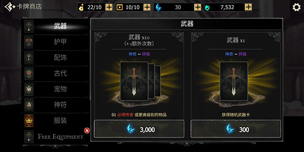 卡牌商店里有多种装备抽取类型,消耗水晶就能抽取各类武器装备,十连抽必定能获得高级装备。