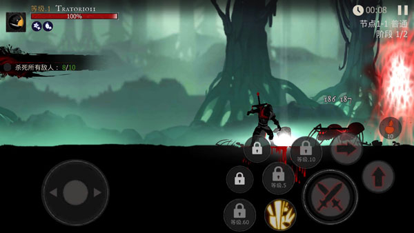 首先谈谈画面呈现。2D剪影风格赋予整体视觉一种简洁利落的质感,与游戏标题“死亡之影”的调性颇为契合。不过剪影风格在横版动作类游戏中并非新鲜设计,例如《黑暗之剑》《火柴人联盟》以及《忍者岚》等作品,都不约而同地采用了这一画风。这类风格的优势在于易于营造出黑暗且紧张的战斗氛围,就连《暗影格斗》这类格斗游戏,也常青睐这种视觉表现形式。