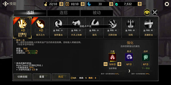 其次来说战斗部分。作为横版动作类型的游戏,核心体验依旧聚焦在战斗环节,涵盖打击感、操作流畅性等多个维度。《死亡阴影》在这方面表现中规中矩,没有太突出的创意亮点,打击感与流畅度基本和《黑暗之剑》处于同一水平;由于缺乏连招设计,玩家只能在方向控制、跳跃、释放招式之间切换操作,时间久了会感觉玩法略显单薄,但好在关卡提供了难度选择,这一点在一定程度上弥补了玩法的不足。 这款游戏在不少地方能看到对《黑暗之剑》的参考与借鉴,但在系统可玩性上,相比这位“前辈”也做出了一些自身的特色。除了装备系统外,游戏在技能层面加入了技能加点的选择机制——技能分为不同分支,不同分支下的加点方案可以根据玩家个人喜好来决定。