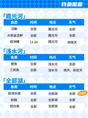 另外需要注意的是,钓鱼爱好等级会限制可垂钓的鱼类品种,这一点至关重要;而且若想捕获某些特殊种类的鱼,还得在特定的天气条件和水域位置下才有可能实现。