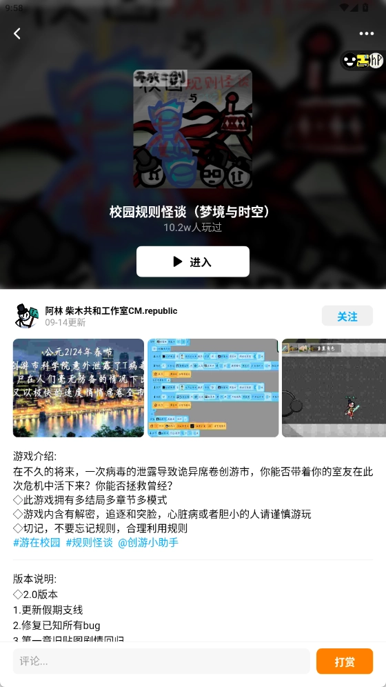 《校园规则怪谈》是创游世界平台上一款由玩家自制的游戏,其出色的设计让它在上线后迅速收获了大量玩家的喜爱。游戏包含多种不同结局,玩家的每一次选择都可能左右最终走向,互动性十足。同时,游戏营造的紧张刺激氛围也十分到位,感兴趣的话不妨亲自体验一番!