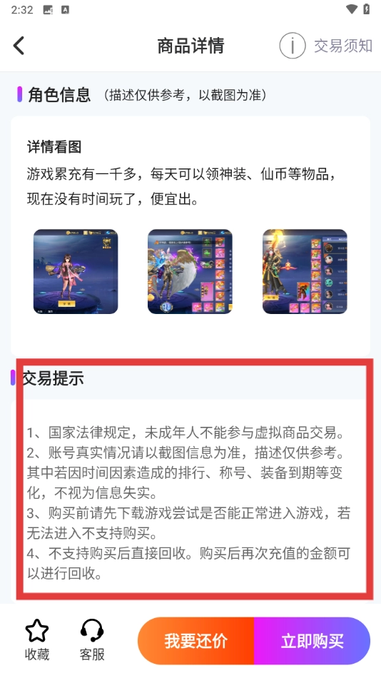 未成年人不得参与游戏账号交易,建议您提前完成实名信息绑定。
