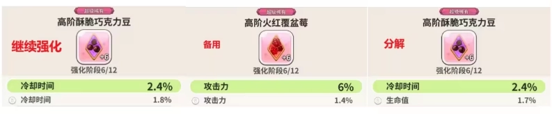 【伤害抵抗】不足4%、【冷却时间】不足1.5%、【攻击】不足2%的饼干,可以先搁置起来备用,等之后留给不常用的饼干使用;要是没有这种需求,就直接分解掉。