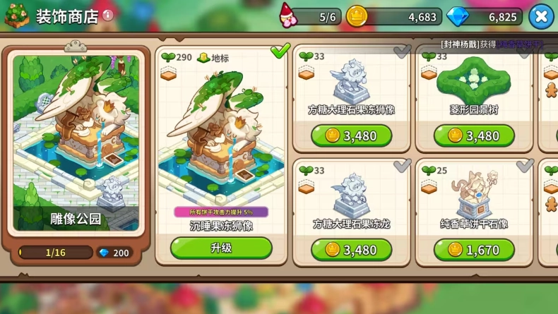 我看到有人建议,先把能给角色提供加成的建筑搭建起来,像这个沉睡果冻狮像,就能为所有饼干增加5%的攻击力。