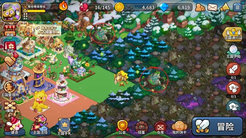 有加成效果的建筑:部分建筑具备加成属性,这类建筑通常可在装饰商店中购买;随着你逐步解锁地图上的地面区域,这些建筑也会相应解锁——也就是我在下图里用圈标注出的那些。