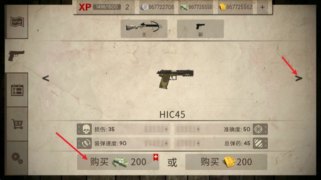 武器被划分为主武器和副武器两类,进入对应界面后点击箭头就能切换不同的武器,之后就可以进行购买操作了。