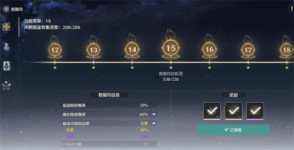 想快速刷到金色声骸的话,得先借助声骸图鉴把数据坞升到满级才行。声骸只需要培养金色的,其他颜色的都可以当升级材料用。前期不用太纠结声骸的副词条,能凑合用就可以了。升级声骸的材料密音筒在前期很稀缺,别随便浪费,升级时可以先升到+10或者+15,够用就行,等后期遇到词条完美的声骸再把等级拉满到+25。