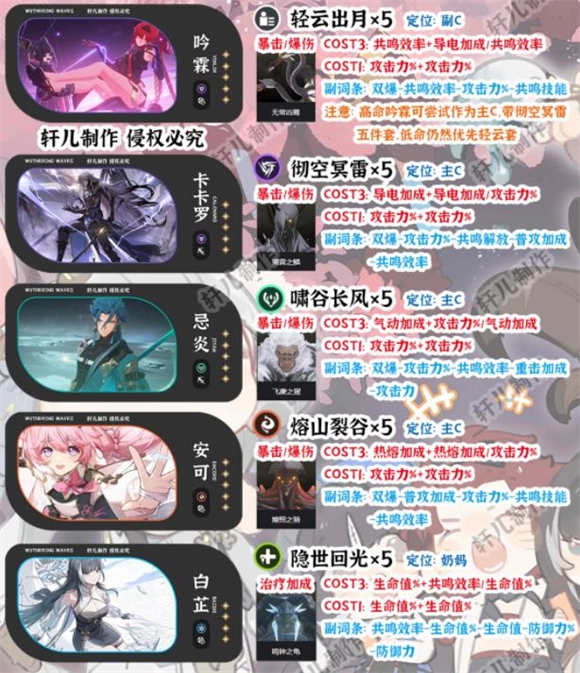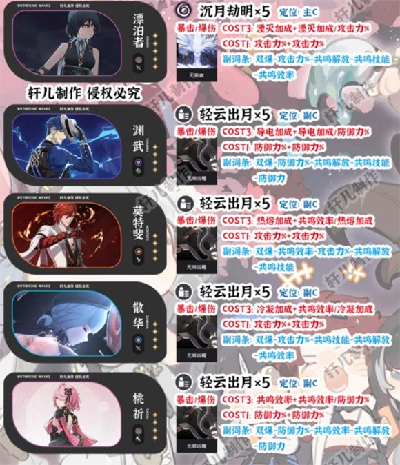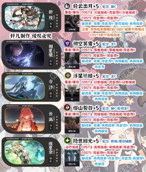 光主是除今汐外回路秒均秒伤最高的角色,命座全部免费获取,共鸣解放后的面板数值也不低,玩法多样且成熟,同时具备主C和副C两种定位。如果已经培养了今汐,甚至可以直接把声骸拆过来给光主用,而且采用奶套搭配光主的玩法,在后续版本中也能有稳定的就业空间。
