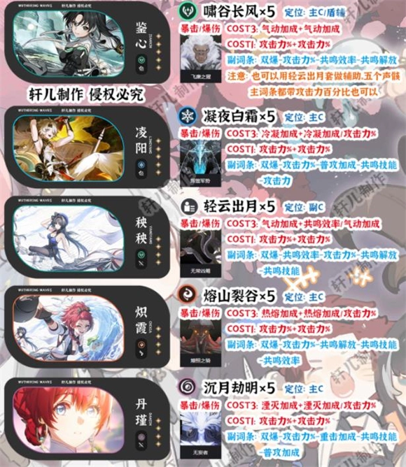 吟霖算是单人延奏buff切换角色后失效的主要受害者之一。作为五星角色,她单波爆发的倍率和3链散华持平,面板属性确实很让人头疼。她主要依靠回路机制打核心后台伤害,但后台每跳伤害甚至还比不上今汐的韶光技能。要是组双金队伍,今汐搭配长离的组合比今吟花组合强不少。卡吟组合现在也是版本里的弱势队伍,在深塔中的体验不太好。目前吟霖更推荐的搭配是相里要,今汐也有造价更低的今武门组合可选。