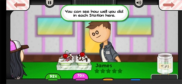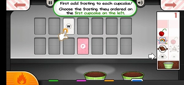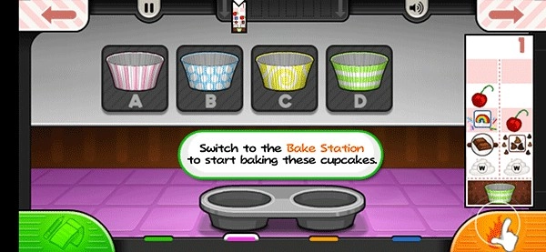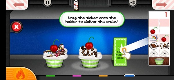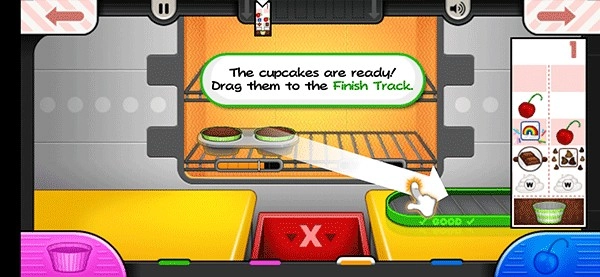 然后切换到制作站,根据右侧顾客订单上的要求给纸杯蛋糕加上装饰。