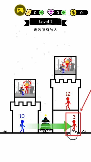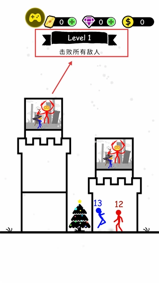 击败当前敌人后继续推进,操控数值为【13】的蓝色火柴人应对剩余敌人,朝着击败所有敌人的目标前进。