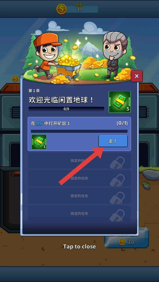 1、完成【第1章-欢迎光临闲置地球!】里的【在煤矿中打开矿层1】任务,点击“走!”按钮就能启动采矿进程。