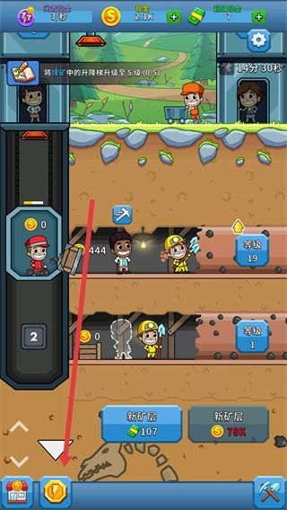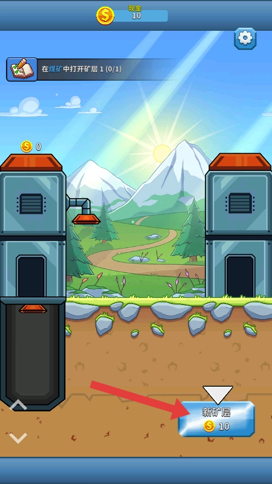 2、消耗10美元现金点击“新矿层”,开启煤矿的第1矿层,解锁采矿区域。