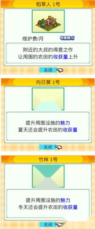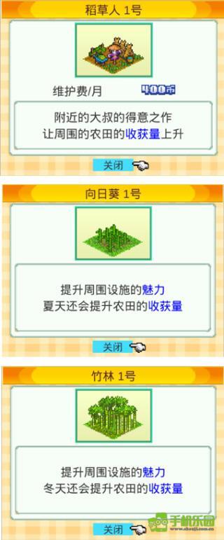 除了道具之外,搭建合适的环境设施同样能增加作物产量。稻草人在提升产量方面效果显著。另外,部分环境设施会依据季节对产量产生加成作用,比如竹林有助于提高冬季的收成、向日葵能够提升夏季的收成等。