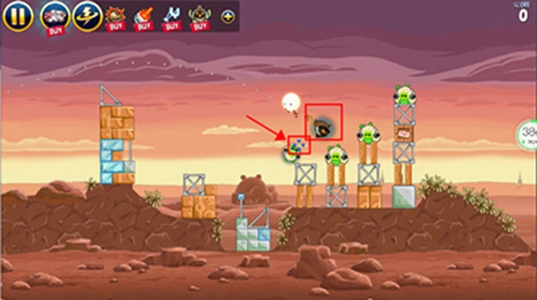【1-5】第五关的鸟可不普通,发射时点击屏幕,点击位置会产生一股冲击力(如图中红框所示),借助这个特性,就能把猪猪震开。