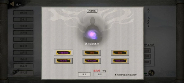 在突破之前可以先保存一下进度。突破完成后选择“逆天改命”选项,我这里有御龙山庄的气运,所以选了“小跟屁虫”。第一次选逆天改命的时候没什么特别好的选项,我推荐选“水力四射”,如果需要提升阅读速度的话也可以选“速读”,另外“小李飞剑”也是一个可选的。还有一些选项我没太注意,大家可以根据自己的情况决定。等后面阶段,必须要选的逆天改命有“杀心骤起”“凝元寂灭”和“龙魂虎魄”。