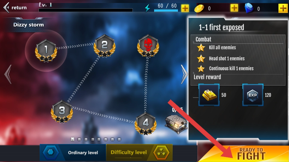 1、启动游戏后,在主界面点击“Campaign Mode(战役模式)”,选择“Dizzy storm”章节下的1-1关卡,查看任务详情后即可开始战斗。