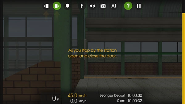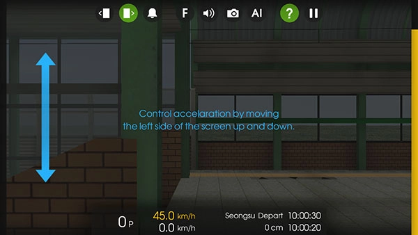 -玩家把右侧的黄色减速条拉到0,左侧加速条拉到1至5档中的任意一档,列车就能启动了。抵达目的地后,得把列车停在标准线范围内才能打开车门上下客,可别错过站台哦!