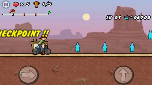 在加速的时候需要留意,因为自行车的助力依靠脚蹬,所以得连续点击才能实现加速。这对跳跃一些跨度较大的障碍会有一定帮助,另外,游戏里在不同节点设有存档点,经过就会自动存档,但挑战机会是有限的,得好好把握!